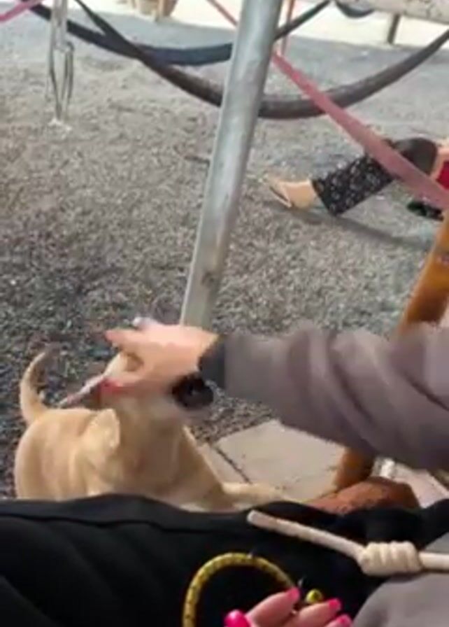 A short video shows a light-tan puppy playfully nipping at the arm and hands of a person with bright pink nail polish