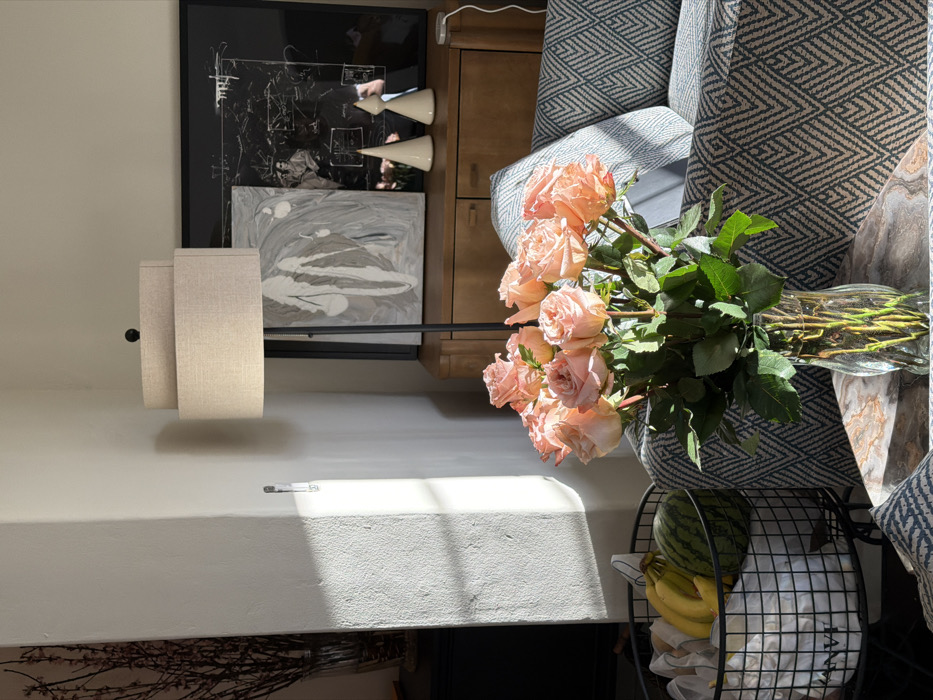 The scene is an interior residential space, located in Los Angeles, United States of America. In the foreground, a clear, fluted glass vase holds a bouquet of approximately 15-20 pink-peach roses with green leaves, positioned on a marbled-patterned coffee table. To the left, a black wire basket rests on the floor, containing three yellow bananas, a small green watermelon, and several white paper bags, one of which displays the text "LANVI". Strong, directional sunlight illuminates the textured white wall behind the basket, casting a distinct shadow line. In the midground, behind the coffee table, a sofa upholstered in a blue-grey fabric with a repetitive chevron pattern is visible, topped with a plain light grey throw pillow. To the right of the sofa, a black floor lamp with two stacked, rectangular beige fabric shades stands. Behind the lamp and sofa, against the wall, is a wooden console table. On this table, two art pieces lean vertically: a grey and white abstract painting and a larger framed black-and-white abstract artwork that includes white linear elements and a faint human figure. A reflection of a person holding a camera is discernible in the glass of the larger framed artwork. To the right on the console table, two white conical decorative objects of different heights are present, along with a white charging cable and adapter. In the far left background, a tall clear vase holds an arrangement of dry, slender branches.