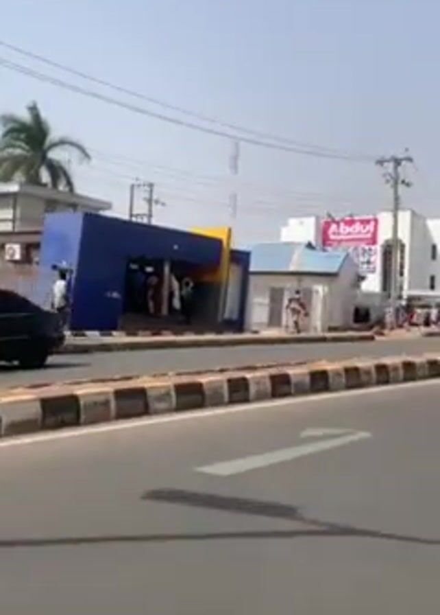street scene on a sunny day. A black car drives by on the road. On the side of the road, there is a modern-looking building with a blue and yellow exterior. People are standing outside the building, seemingly waiting in line. Behind the building, there are other buildings and trees. Power lines are visible in the sky.