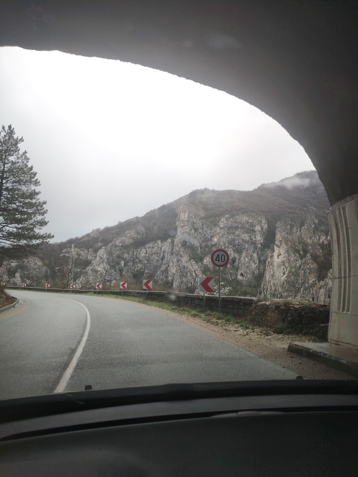 The view from inside a vehicle as it enters a tunnel. The scene is set on a winding road in Lyutibrod, Bulgaria, with a mountain range in the background. The range is predominantly composed of light-colored, rugged rock formations. The foliage is sparse, with trees and shrubs clinging to the slopes. The weather is overcast, and the mountaintops are shrouded in mist or low clouds. A 40 km/h speed limit sign is visible. The road is marked with a solid white line, and chevron signs line the roadside indicating the curve of the road. A single tree stands beside the road. The interior of the vehicle, specifically the dashboard, is visible in the foreground.