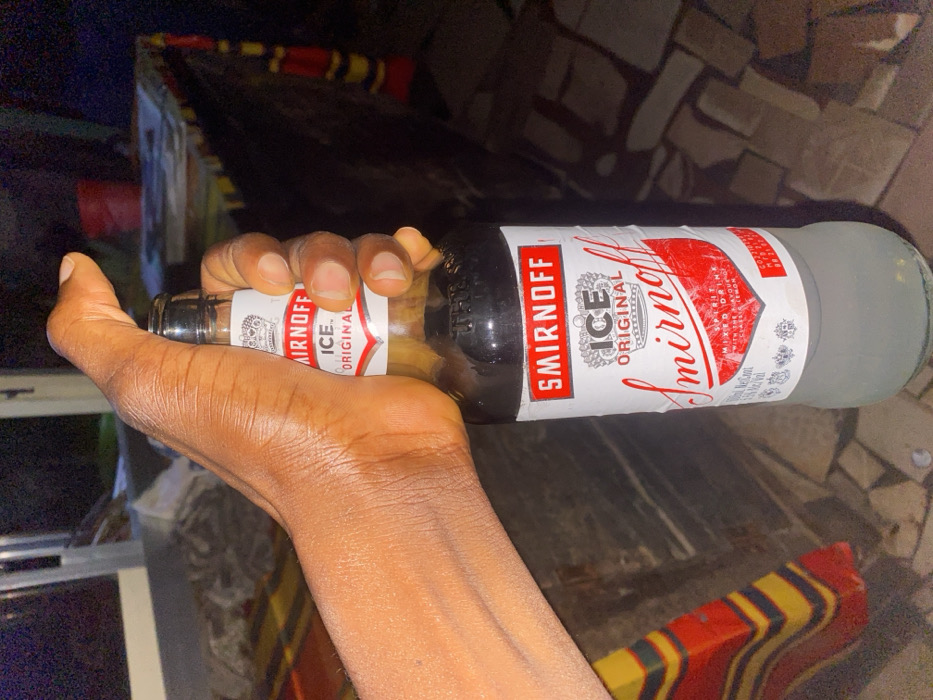- "A dark-skinned right hand is centrally positioned, gripping a clear glass bottle of Smirnoff Ice Original" by FM-GjRw62, licensed under CC BY 4.0