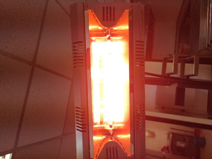 - "An indoor scene in Cornellà de Llobregat, Spain, is captured from a low, upward-angled perspective, dominated by a horizontally mounted infrared heater in the upper center" by FM-128c92, licensed under CC BY 4.0