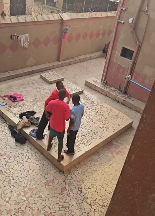 three men on a rooftop or courtyard with a tiled surface. Two of the men are wearing red shirts, while the third is wearing a light blue shirt. They appear to be in some kind of conflict or physical altercation, as they are close together and appear to be grabbing at each other. There are clothes and shoes scattered on the ground near them. The environment is a somewhat urban setting, with buildings and a fence visible in the background. The camera is positioned from an elevated angle, looking down on the scene.