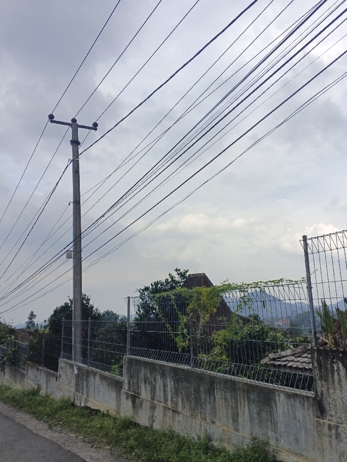 The image depicts an outdoor scene in Siexiengmai, Laos, characterized by a grey, overcast sky. A tall, grey concrete utility pole stands prominently on the left, supporting numerous black overhead wires that extend diagonally across the upper portion of the frame. A small, rectangular grey box is attached to the pole. In the midground, a weathered concrete retaining wall runs horizontally, topped by a grey metal mesh fence. Green foliage, including trees and yellowish-green vines growing over the fence, is visible behind the barrier. Partial views of at least two building roofs are discernible amongst the trees; one features a steep, dark brown roofline, and another tiled roof is visible further in the background. A narrow asphalt road runs along the bottom left edge of the frame, with a strip of grass and weeds bordering the concrete wall. Distant hills or mountains are present under the cloudy sky in the background. No individuals or active subjects are visible.