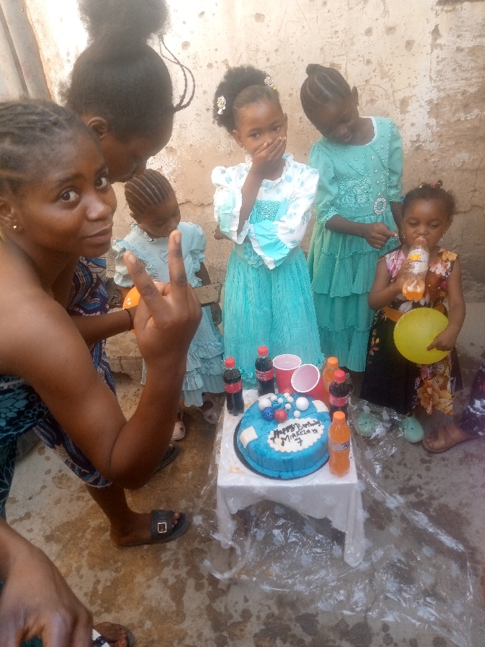 An outdoor birthday celebration is depicted in a daytime scene in Pantame, Nigeria, featuring six individuals of varying ages and a blue birthday cake. In the left foreground, an adult female with dark skin and braided hair wears a patterned sleeveless garment, looking directly at the camera with a slight smile. Her right hand is raised, forming a "V" sign with her index and middle fingers. Behind her, another adult female's head with dark hair tied up is partially visible. To the left-center, a young child in a light blue ruffled dress is partially obscured. In the center, a young girl with dark hair in a high ponytail wears a light blue and white dress with ruffled sleeves, her right hand covering her mouth as she looks towards the camera. To her right, another young girl with braided hair wears a turquoise-colored ruffled dress and looks downwards. On the far right, the smallest child, wearing a colorful patterned dress, holds a plastic bottle of orange soda to her mouth, actively drinking. She also holds a deflated yellow balloon in her left hand. The lower right portion of the frame shows the feet of another individual, clad in sandals. At the center-bottom, a small, square table covered with a white cloth holds a round, blue-frosted birthday cake decorated with white, red, and blue spheres. The cake bears the inscription "Happy Birthday Miracla 7" in white frosting. Surrounding the cake are two red plastic cups, two bottles of Coca-Cola, and two plastic bottles of orange soda. The ground is an uneven surface, appearing to be concrete or packed dirt, with some scattered clear plastic sheeting. The background features a light-colored, worn wall with visible discoloration and minor structural imperfections. The overall lighting suggests a bright, outdoor environment.