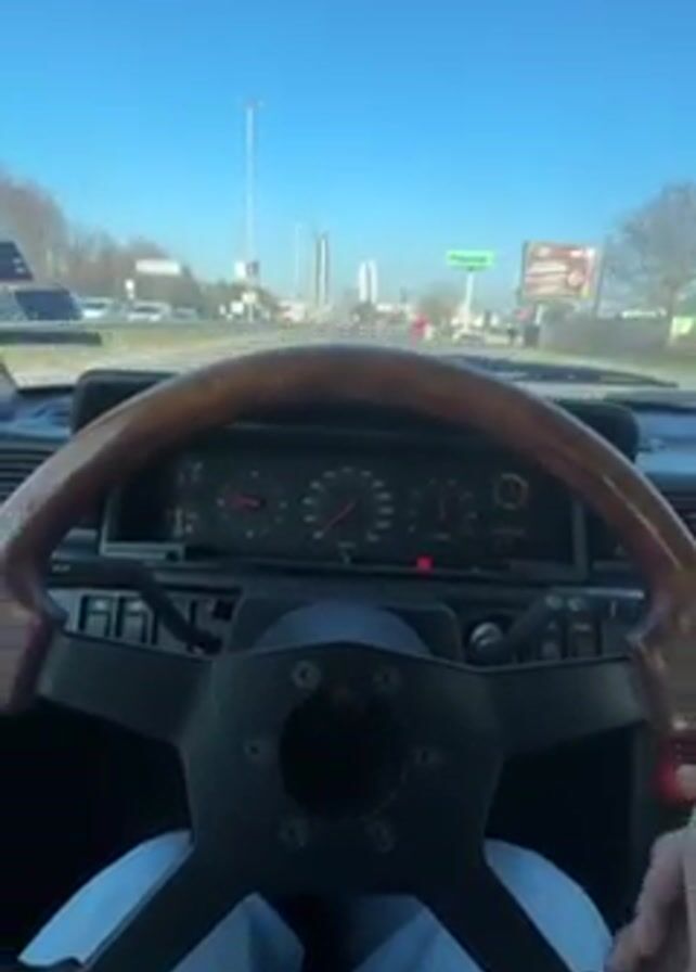 view from the driver's seat of a car moving on a highway during a clear, sunny day. The driver, wearing jeans, holds a wooden-rimmed steering wheel. The dashboard is visible, with gauges displaying speed and other metrics. Outside the car, the landscape includes trees, other vehicles, billboards, and distant buildings that could be part of a city skyline. The road appears straight and relatively clear, with the car moving at a moderate speed.