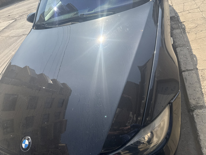 The image displays the front portion of a dark-colored BMW car, observed from an elevated vantage point, parked outdoors on a clear day in Sofia, Bulgaria