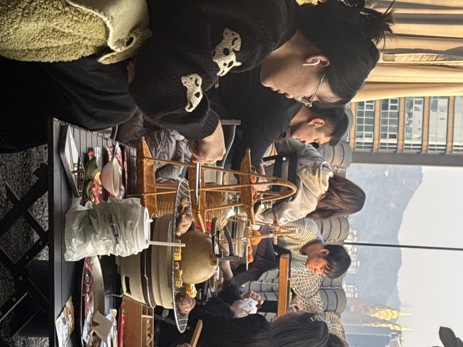 The image captures an outdoor social gathering on a rooftop or elevated terrace in Yuzhong District, China