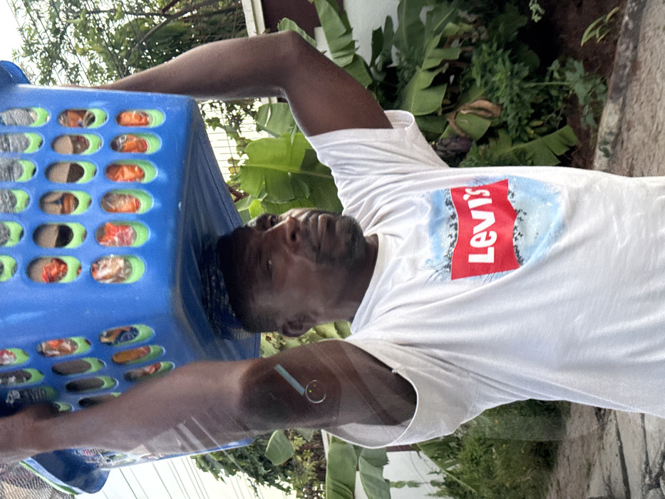 An African-American man in a Levi's t-shirt holds a blue plastic basket full of groceries. He stands outside near banana plants and other greenery. The photo is angled, making it appear he's on his side. He looks towards the basket with a concentrated expression. The basket is in focus, showcasing the diverse food items inside. A medical device is visible on his arm.