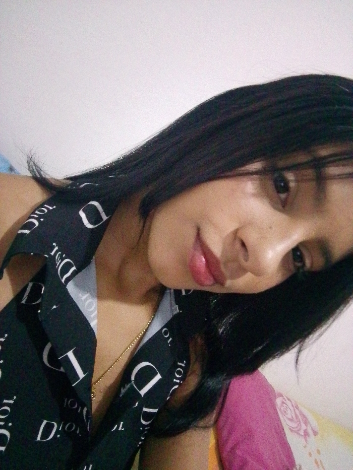 A close-up, angled portrait depicts a single individual, identified as female, with dark, straight hair extending over her shoulders. Her head is tilted approximately 15-20 degrees to her left. She presents with light brown skin, dark eyes maintaining direct eye contact with the camera, a prominent nose, and full lips accented with a glossy pink tint. Her expression is neutral to slightly smiling. She is attired in a black garment featuring white repeated text resembling "DIOR," draped around her neck and upper chest, possibly a scarf or part of a top. A thin, gold-colored chain necklace is visible beneath the black garment, resting against a light-colored, possibly white or light grey, undergarment. The background in the upper half consists of a plain off-white wall. The lower right portion of the image displays blurred soft furnishings, including a pink fabric with a faint lighter pattern, consistent with an indoor domestic environment such as a bedroom. The image provides no visual information to confirm a specific location within the city of Los Robles, Venezuela.