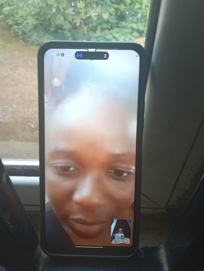 A smartphone, encased in a dark-colored protective case, is depicted in an upright position, displaying an active video call. The main screen shows a person with dark skin, illuminated from the front, looking slightly downwards with a neutral expression. In the bottom-right corner, a smaller picture-in-picture window reveals the reflection of the individual capturing the image, identifiable by a beard and dark skin, holding a light-colored phone. The phone's status bar displays the time as "4:01", a WhatsApp icon, and a dynamic island-style notification indicating a communication activity (likely a call or Wi-Fi symbol) with the number "2", alongside a small green dot in the upper right, suggesting active camera or microphone use. The smartphone rests on a dark, flat surface with a vertical dark structural element visible to its left. The background beyond the phone is an out-of-focus expanse of dense green foliage, indicating an outdoor setting viewed from an indoor vantage point in the city of Unknown, Unknown.