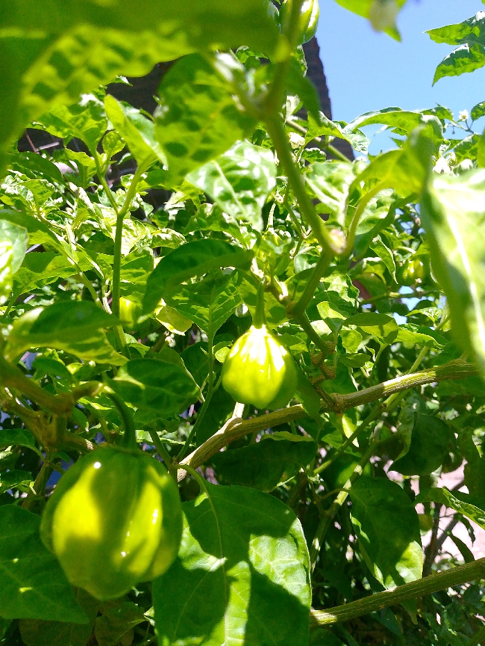 - "Green Scotch Bonnet peppers hang from a plant filled with variegated green and white leaves" by FM-eI8CE3, licensed under CC BY 4.0