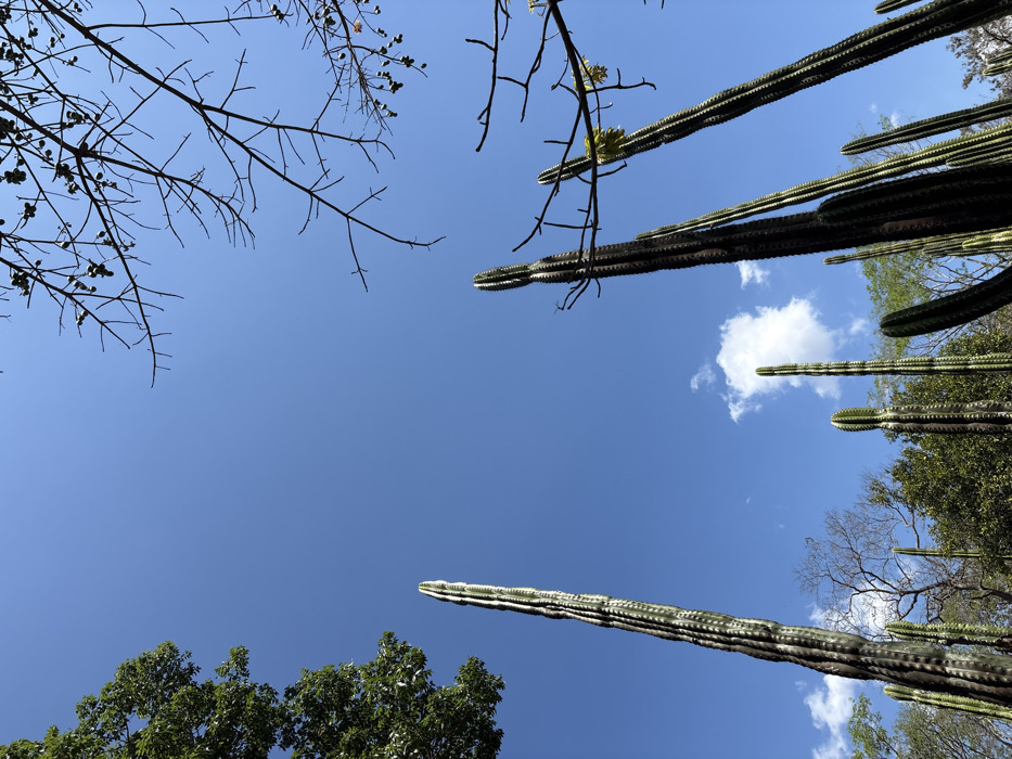 The scene, set in the city of Unknown, Costa Rica, depicts a low-angle perspective looking upwards into a bright, clear blue sky with a few scattered white cumulus clouds. Numerous tall, columnar cacti, characterized by their ribbed, green stems, ascend vertically from the lower frame, some extending significantly into the sky. A dense canopy of green foliage from a broadleaf tree is visible in the upper-left quadrant. In the upper-right quadrant, bare tree branches bearing small, dark, spherical structures and some nascent light green foliage or flowers are silhouetted against the sky. Additional tree canopy and bare branches are visible in the lower background. No people are present. The environment is natural and indicates direct sunlight.