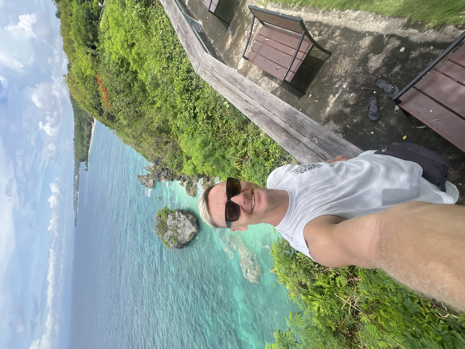 A selfie captures a man wearing sunglasses and a white shirt on a cliffside walkway. Lush green vegetation lines the cliff edge, overlooking turquoise waters with rocky outcrops. The scene stretches out to a distant coastline under a partially cloudy sky. Benches and abandoned flip-flops suggest a public area. The image is rotated, giving a tilted perspective of the landscape.