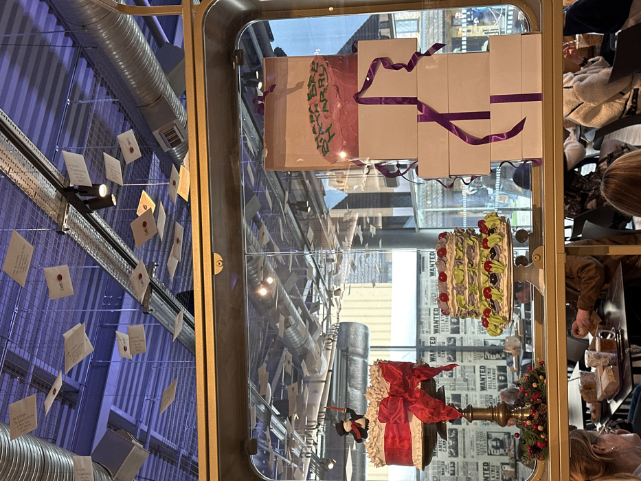 The scene is an indoor establishment, identified as a cafe or bakery, located in Three Rivers, United Kingdom. The upper portion of the image reveals a ceiling with exposed silver ventilation ducts, black track lighting fixtures, and a metal grid, all appearing under a purple illumination. Numerous cream-colored paper letters, each sealed with a red wax-like stamp, are suspended at various heights from the ceiling grid. Occupying the midground is a large display case with a gold-colored frame, showcasing three distinct arrangements. On the left, a multi-tiered white cake, adorned with a large red bow, is topped by a small figure dressed in a dark coat and hat, holding a red stick. This cake rests on a golden pedestal, which is decorated at its base with a small green and red festive wreath. To its right, a multi-layered cake with green and purple frosting, decorated with red cherries and dark berries, sits on a white pedestal. Further to the right, a vertical stack of four plain white gift boxes is secured with purple ribbons. The topmost box contains a pink cake with the words "HAPP BIRTDA Y HARRY" piped in green frosting. Through the glass of the display case and the windows behind it, an outdoor urban environment is visible, characterized by light-colored stone buildings and distant pedestrians. A wall in this background displays multiple "WANTED" posters. The lower portion of the image depicts the interior of the establishment, where several patrons are seated at dark tables with dark chairs. Objects on the tables include white coffee cups and plates with pastries. Individuals are partially obscured, with a woman having blonde hair visible in the lower-left corner. Patrons are engaged in seated consumption of refreshments.