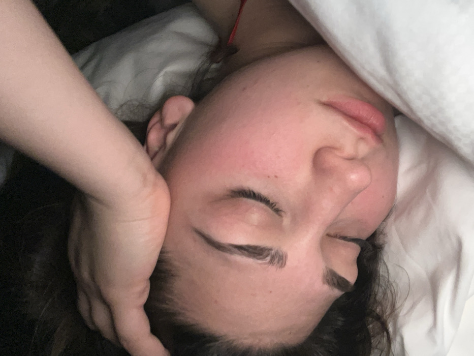 A woman lies in bed, face turned toward the camera. She is under a white comforter and resting on a pillow. Her eyes are closed and she has dark eyebrows and lashes. Her hand is near her ear, with fingers curled. Her skin appears flushed. Her hair is dark.