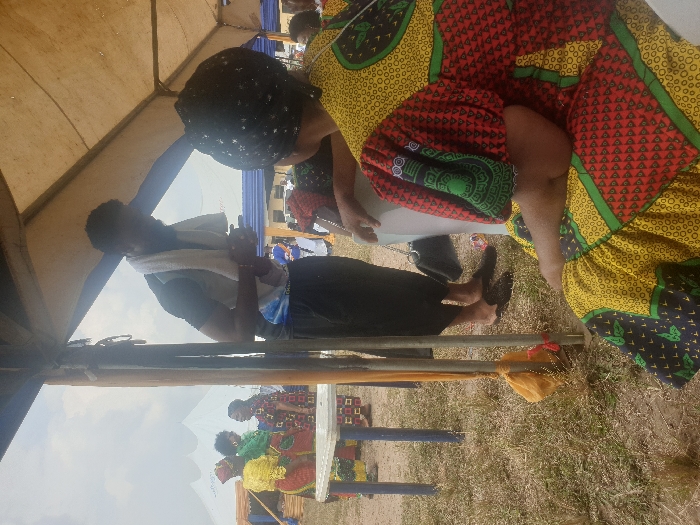 Under a tent, a person in a black shirt and white shawl prays with hands clasped, while another person in a colorful patterned dress sits nearby. A line of people in brightly colored clothing and headdresses stands in the background. The scene takes place outdoors, with grass visible on the ground. An orange cloth is tied to a pole in the foreground.
