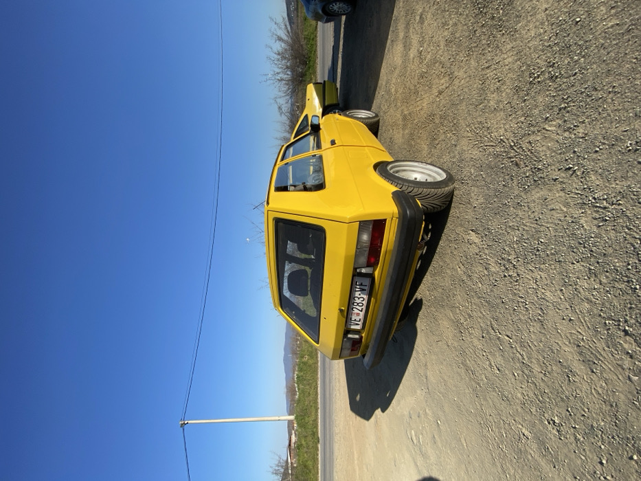 The image captures an outdoor scene in what appears to be a semi-rural area of North Macedonia, indicated by the "VE" prefix on the license plate, which corresponds to Veles. The primary subject is a bright yellow, two-door hatchback automobile, consistent with a Zastava Yugo, parked on an unpaved, light brown dirt and gravel shoulder in the foreground. The vehicle is positioned with its rear-three-quarter facing the viewer, angled slightly towards the left. It is equipped with custom silver-colored multi-spoke wheels and low-profile tires. The rear features a black bumper and a North Macedonian license plate, "VE 283-VF," centrally affixed. The rear and side windows are dark, revealing dark-colored seats within the cabin. To the right of the yellow car, a light yellow or cream-colored sedan is partially visible, parked with its trunk lid open. A small section of a dark blue or grey vehicle is also discernible further to the right. To the left of the primary vehicle, a paved road with a light grey surface extends. Beyond the road, sparse, dry vegetation, including small bushes and bare branches, is present. A tall, light-colored utility pole with overhead electrical wires stands on the left side of the frame. The sky above is clear and deep blue. Faint outlines of distant hills or mountains are visible on the horizon. The scene is brightly illuminated by direct sunlight, casting a pronounced shadow of the yellow car towards the front-left. No individuals are present in the image.
