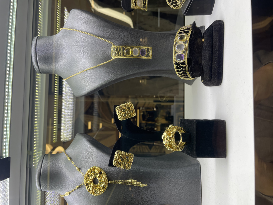 The image displays a well-lit jewelry showcase located in Yerevan, Armenia
