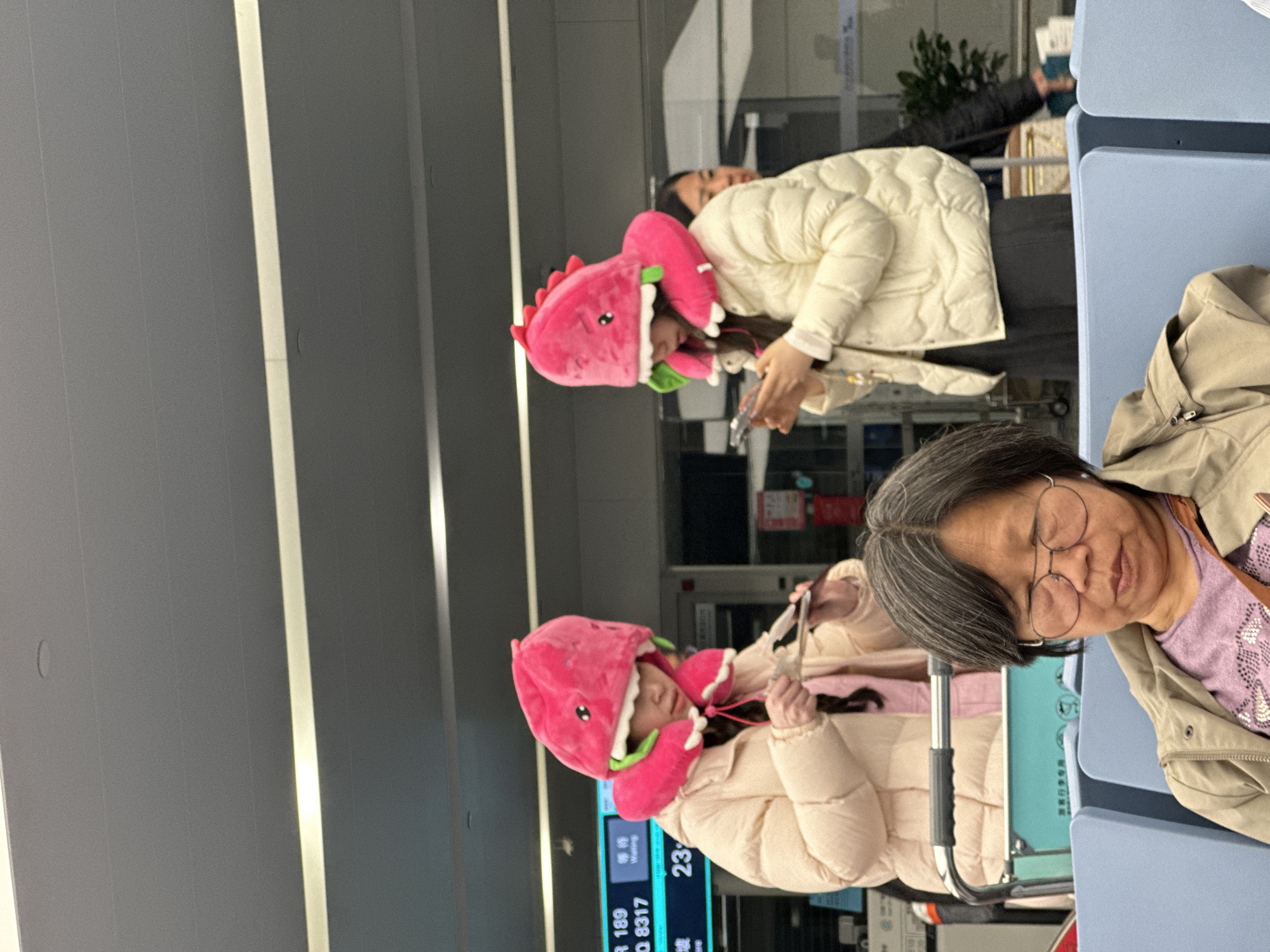 The image captures an indoor public waiting area, likely within Hangzhou Xiaoshan International Airport in Xiaoshan District, China. In the foreground, an East Asian adult female is seated on a light blue plastic bench, facing slightly left with her eyes closed, suggesting rest or sleep. She wears circular eyeglasses, a light brown or khaki jacket, and a purple patterned top. Her short, dark hair shows visible graying. Behind her, two young adult East Asian females are visible in the mid-ground. Both wear distinctive bright pink plush hats shaped like cartoon watermelons or dragon fruits, with green accents and integrated pink neck pillows. They are both dressed in light beige or cream-colored puffer jackets. The woman on the left is looking down, holding and manipulating a small, rectangular object, possibly a smartphone or documents. A light blue metal luggage cart, partially inscribed with Chinese characters (identifiable as "旅客行李专用" - Dedicated for Passenger Luggage), is positioned next to her. The woman on the right is engaged with a smartphone held in both hands. In the background, a blue digital information screen displays text including "R 189", "Q 8317", "等待" (Waiting), and "23". Further to the right, a partially visible, out-of-focus East Asian adult female figure is present. The environment consists of gray walls, a gray ceiling with recessed lighting fixtures and linear light strips, and rows of light blue public seating. No direct interactions between the subjects are depicted.