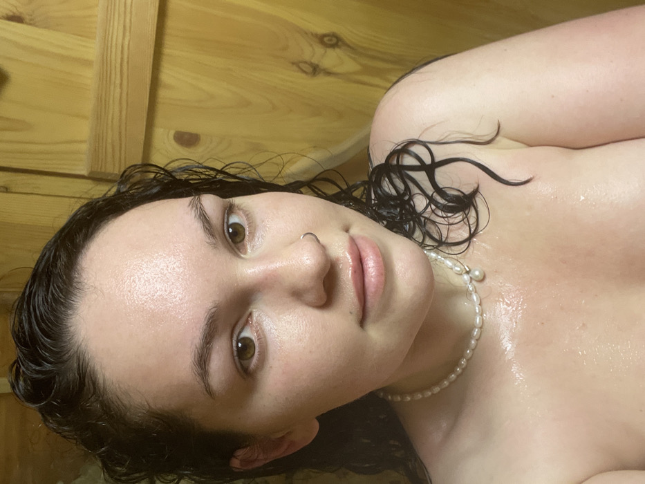 A young woman with damp, dark hair and fair skin lies on a wooden surface. She wears a pearl necklace. A small ring adorns her nose. The scene appears steamy, perhaps a sauna. Her lips are full and pink. Her skin has a glistening, dewy look. She gazes directly at the viewer with a serene expression. The wooden boards form a background, with a visible seam between two planks on the left side.