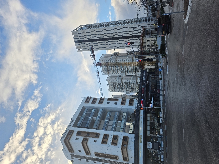 The image captures an urban street intersection in Rishon LeZion, Israel, specifically at the junction with Jabotinsky Street, identifiable by the "Pik Place" building sign. On the left, a multi-story white building with brown architectural accents and balconies dominates, housing ground-level commercial establishments including one labeled "Pik Place" in Hebrew. In the center-right, a cluster of high-rise buildings is under active construction, characterized by exposed concrete structures and scaffolding. A prominent yellow tower crane stands among these construction sites. To the far right, a tall, slender, modern high-rise building, featuring a white facade with striking vertical black strips, appears completed or nearing completion. The foreground depicts an asphalt street intersection with visible lane markings. Traffic lights at the intersection are illuminated red. Various street signs are present, including a blue circular sign with a white arrow, indicating a mandatory direction. A dark-colored van is positioned on the right side of the intersection. The sky above is partially cloudy, with scattered white clouds against a background of blue. No individuals are discernible in the scene.