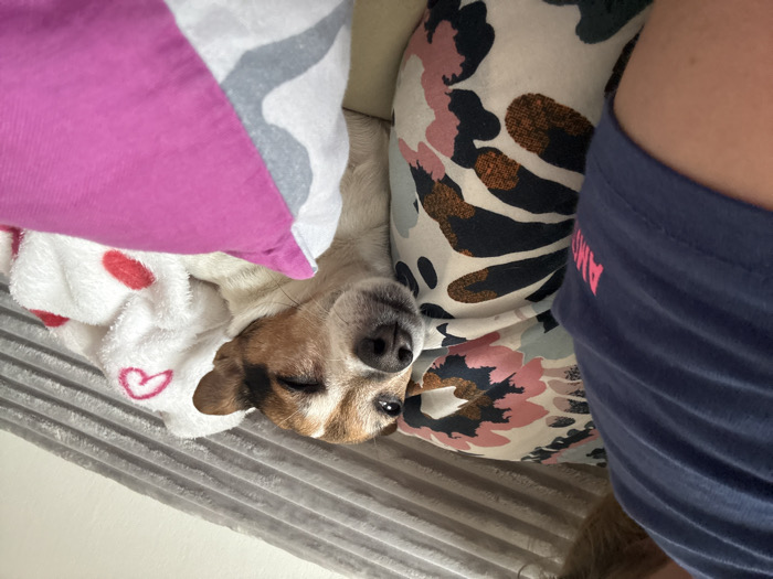 An indoor scene in Bad Nauheim, Germany, depicts a small, tricolored dog, likely a Jack Russell Terrier, resting beside a human. The dog, with brown, white, and black markings, is positioned on its side, partially covered by a white, plush blanket adorned with red heart patterns. Its right eye is visibly squinted or partially closed. Adjacent to the dog is a human's left upper arm and shoulder, clad in a navy blue t-shirt with faint pink lettering, possibly "AM," on the sleeve. The human's arm rests against a pillow featuring a floral or abstract pattern in pink, black, and brown on a white background. Another pillow, pink with a white and grey geometric design, is visible in the foreground to the dog's right. The background consists of a ribbed grey fabric, indicative of a couch back or a throw blanket. The overall environment suggests a comfortable, domestic setting.