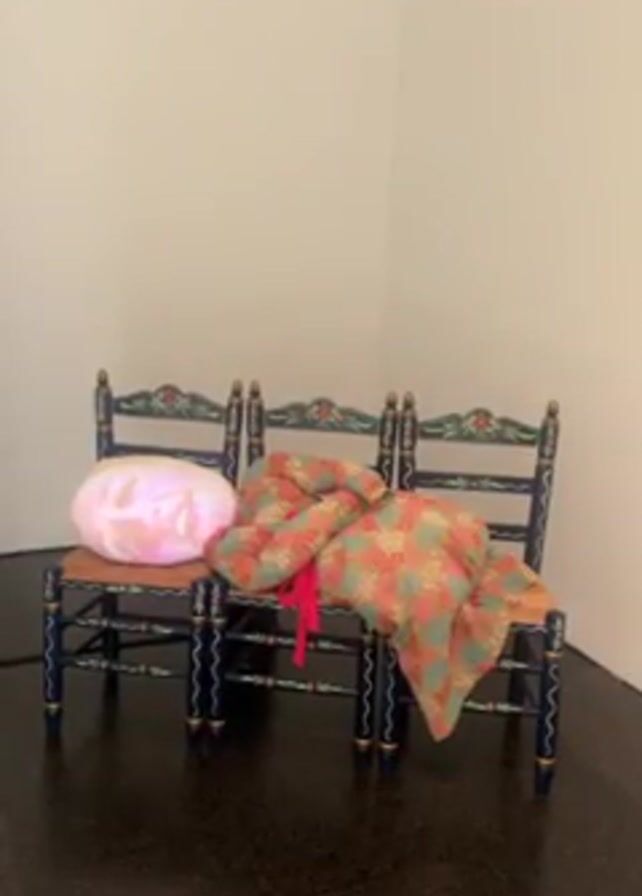 Three blue and tan wooden chairs with floral designs are arranged side-by-side against a white wall, positioned in a corner. A shiny pink pillow sits on the seat of the leftmost chair. A multi-colored quilt with red ties is draped over the two chairs on the right. The floor is a dark, mottled brown. The camera is static, capturing a still shot of the scene.