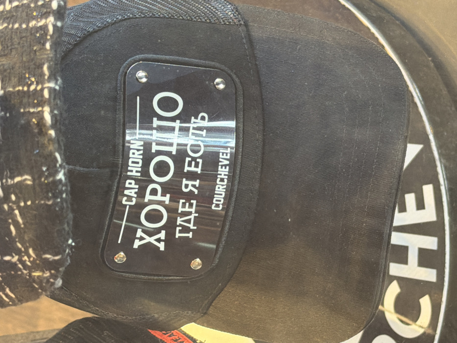 A black baseball cap, featuring a solid fabric front and mesh side panels, is displayed in Courchevel, France. The cap has a curved black brim. Centered on the front panel is a clear, rectangular acrylic plaque, secured by four silver-toned studs. The plaque bears white, sans-serif text: "CAP HORN" at the top, "ХОРОШО ГДЕ Я ЕСТЬ" (translating to "It's good where I am") in Cyrillic script in the middle, and "COURCHEVEL" at the bottom. A textured, black and white fabric, possibly tweed, is visible above the cap. The base of the cap rests on a surface, revealing partial white capital letters "CHE" from the word "COURCHEVEL," indicating a display context within the city of Courchevel. No individuals are present in the scene.