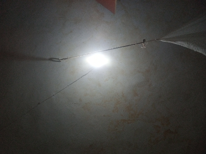 A dimly lit, slightly textured ceiling with a stark, bright light in the center. A thin wire stretches horizontally across the image, bisecting the light. An object is attached to the wire on the left and right sides of the light. The ceiling's surface appears to be mottled with subtle variations in color, giving it a weathered appearance. The overall atmosphere is subdued and somewhat mysterious due to the contrast between the bright light and the surrounding darkness.