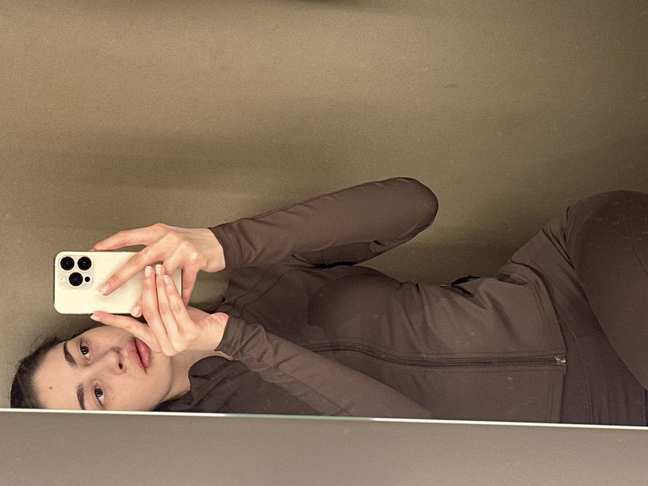 A solo female subject is depicted taking a mirror selfie indoors. The subject, an adult woman with dark hair pulled back and a light complexion, is reflected in a mirror from her upper torso to her mid-thigh. She is dressed in a dark brown, long-sleeved athletic zip-up top and matching form-fitting leggings. Both hands hold a light-colored iPhone, featuring a triple-lens camera array, positioned to capture her reflection. Her fingernails are manicured with light polish. The reflected environment comprises a plain, light brown wall. A dark gray vertical panel or frame is visible on the left edge of the reflection. The specific location within Yekaterinburg, Russia, cannot be ascertained from the visual data.