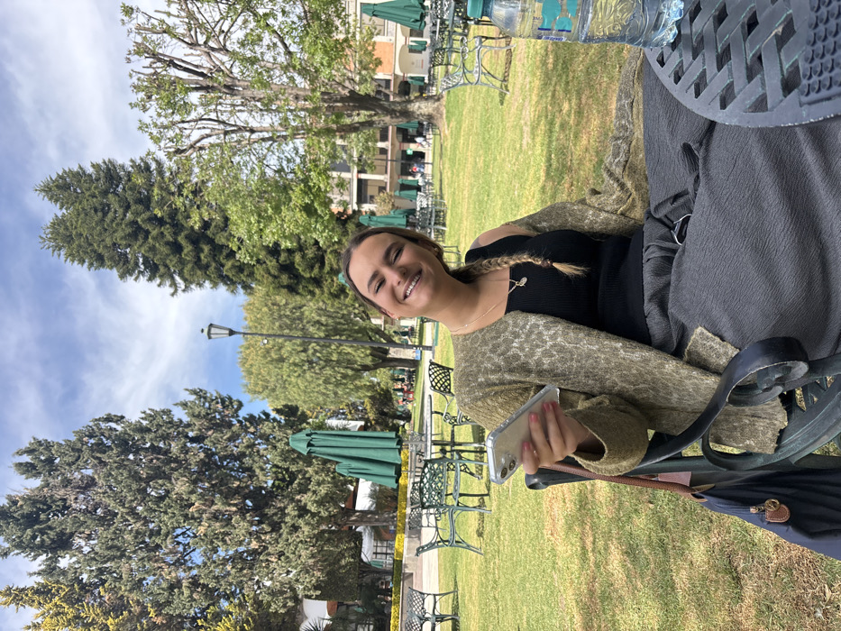 A young woman smiles, holding a phone in her hand, seated at an outdoor table with a drink. She's wearing a black top and an animal print cardigan. Green umbrellas and black iron tables and chairs populate a grassy lawn. Trees rise up in the background under a partly cloudy sky. Buildings are visible behind the trees.