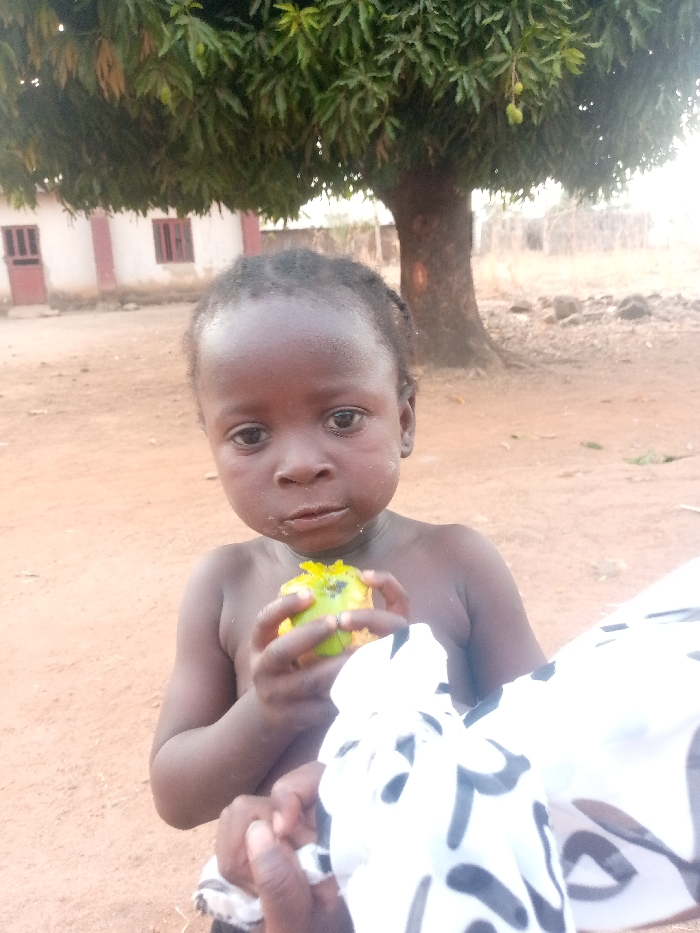 A young, shirtless child with dark skin and short, dark hair is centrally positioned, looking directly forward. The child holds a partially consumed green fruit with exposed yellow flesh, and their mouth is slightly open. In the bottom right foreground, a hand holds white fabric patterned with black shapes. The ground beneath is reddish-brown soil. In the mid-ground, a light-colored building with reddish-brown doors and windows stands to the left. A large tree with dense green foliage and small green fruits is behind the child and to the right of the building. The distant background shows sparse, dry vegetation and indistinct structures, characteristic of an outdoor location in Agban, Nigeria.