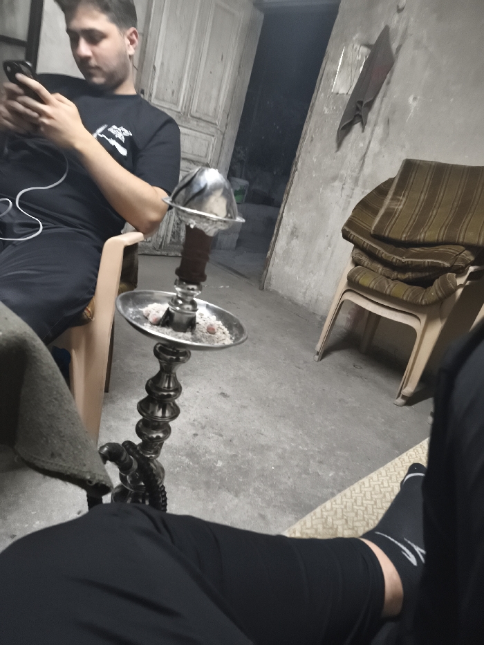 - "An indoor scene shows a man looking at his phone while sitting next to a hookah" by FM-zleBG3, licensed under CC BY 4.0