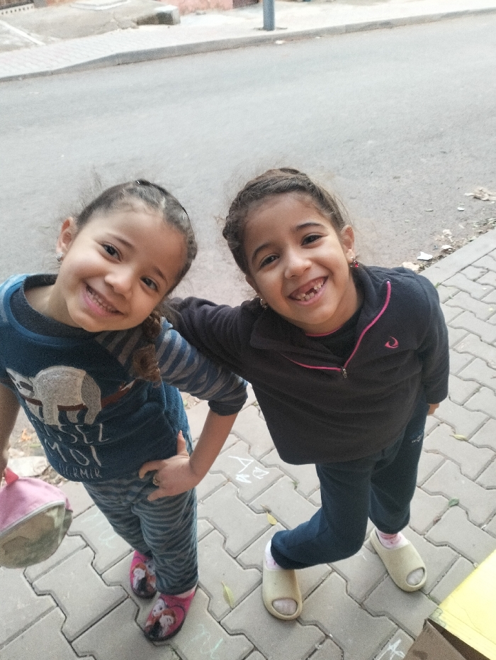 Two smiling young girls stand side-by-side on a tiled walkway next to a street. The girl on the left wears a blue patterned sweater, striped pants, and pink slippers. She holds a pink bag. The girl on the right sports a black zip-up jacket, dark pants, and beige slippers. Both girls have braided hair and are missing some front teeth. The walkway appears to have chalk drawings on it. The background shows a street and sidewalk.