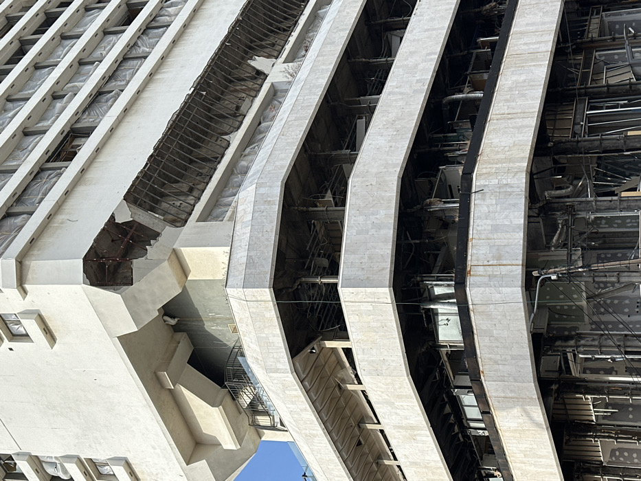 This image depicts a multi-story structure in Tel-Aviv, Israel, exhibiting significant fire and structural damage