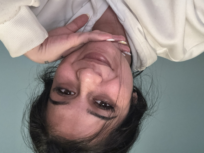 The image depicts a close-up, frontal portrait of a female individual in an indoor setting. The location is specified as Gorna Rositsa, Bulgaria, though this is not discernible from the visual evidence. The subject has dark hair, dark eyes, and a medium complexion, exhibiting a slight smile with closed lips. Her right hand is positioned under her chin, with the fingers supporting her jawline. Her fingernails are manicured with white tips and a yellow accent on the ring finger. A small tattoo, appearing to be Roman numerals "III," is visible on the side of her right hand. She is wearing a light-colored, possibly white or off-white, hooded sweatshirt, identifiable by the ribbed cuff on her right wrist and the hood structure visible over her shoulder. The background is a solid, light blue-green wall. Lighting is soft and appears to be frontal, illuminating the subject's face evenly.