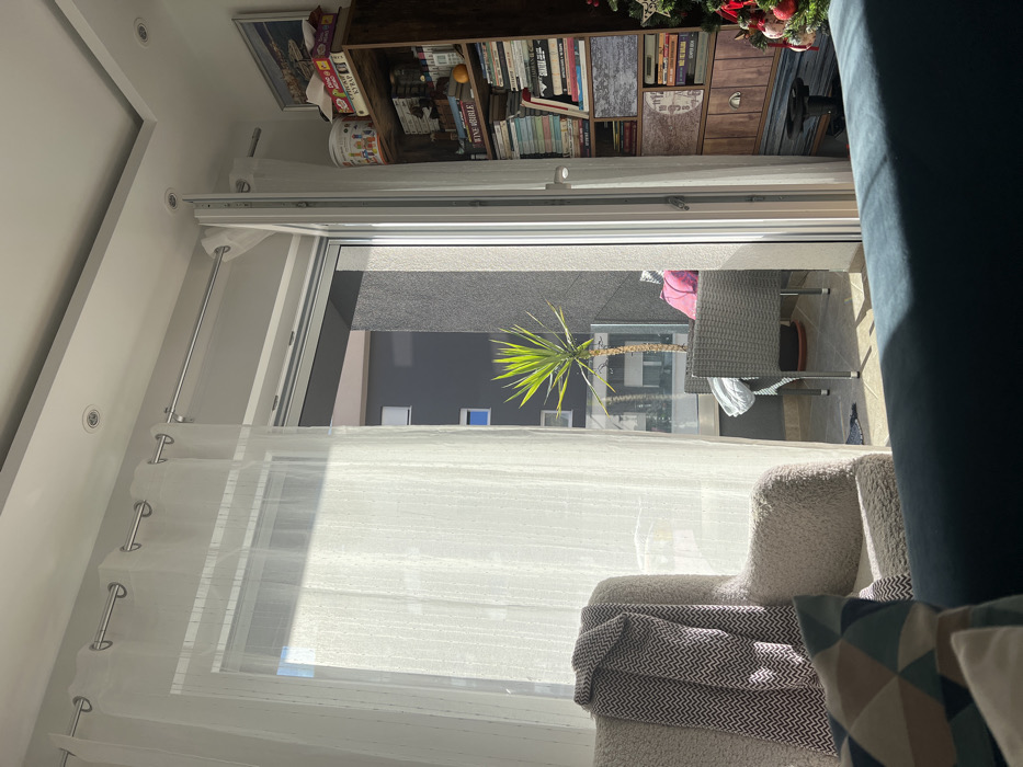 The image presents an interior perspective from a residential apartment looking outward onto a sunlit balcony. In the immediate foreground to the left, a light-colored, upholstered armchair is partially visible, draped with a chevron-patterned throw blanket in shades of light pink and white. A segment of a dark teal sofa with a geometric patterned cushion is visible in the bottom right. White, sheer curtains with eyelet rings hang on a silver rod, partially covering the sliding glass door leading to the balcony. To the right, a tall, dark wooden bookshelf is filled with numerous books, decorative items, and several boxes, including one labeled "DING DONG" and another with Cyrillic text ("КУПУВАМ"). A small orange rests on one shelf. Above the bookshelf, a framed picture depicting a coastal town is mounted. A section of a decorated Christmas tree with red ornaments is visible at the bottom right, suggesting the season. The balcony features light-colored tile flooring and a dark grey textured wall. A potted Yucca plant with bright green foliage stands prominently. Two dark grey, wicker-style chairs are present, one adorned with a light-colored textile and a pink object. Beyond the balcony, a multi-story, dark grey building with rectangular windows is visible under bright sunlight. This residential scene is consistent with an apartment building within the urbanized areas of Budva, Montenegro, characterized by similar modern architectural styles and balconies common in the city.