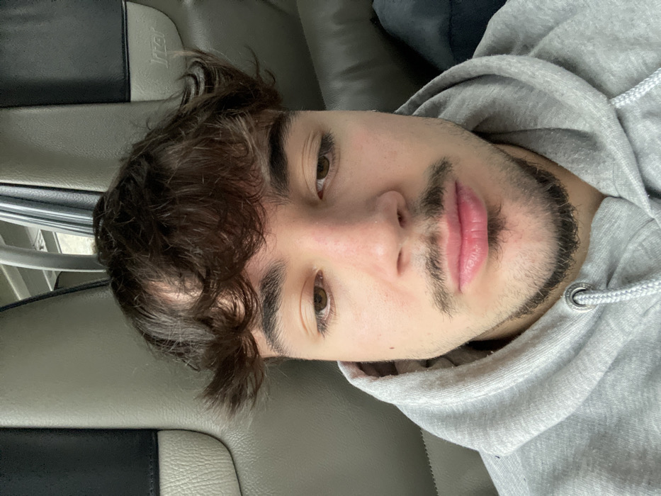 A close-up, front-facing image depicts a male individual, appearing to be a young adult, seated within the passenger cabin of a bus or coach. The subject has dark brown, curly hair, with bangs slightly covering the forehead. His eyes are dark brown and cast downwards, and he has a short beard and mustache (stubble) on his face. He is wearing a grey hooded sweatshirt with visible white drawstrings tied at the neck. The background consists of a tan or light brown upholstered seatback with a black headrest or accent. Partially visible on the black accent is the brand name "Irizar," identifying the vehicle as a bus manufactured by Irizar. A blurred window or light source is present in the upper right background. No specific landmarks or external identifiers are visible to pinpoint a precise location within the city of Bragança, Portugal, beyond the identification of the vehicle type. No other individuals or significant objects are discernible. The subject appears to be looking down, possibly at a handheld device or in contemplation.