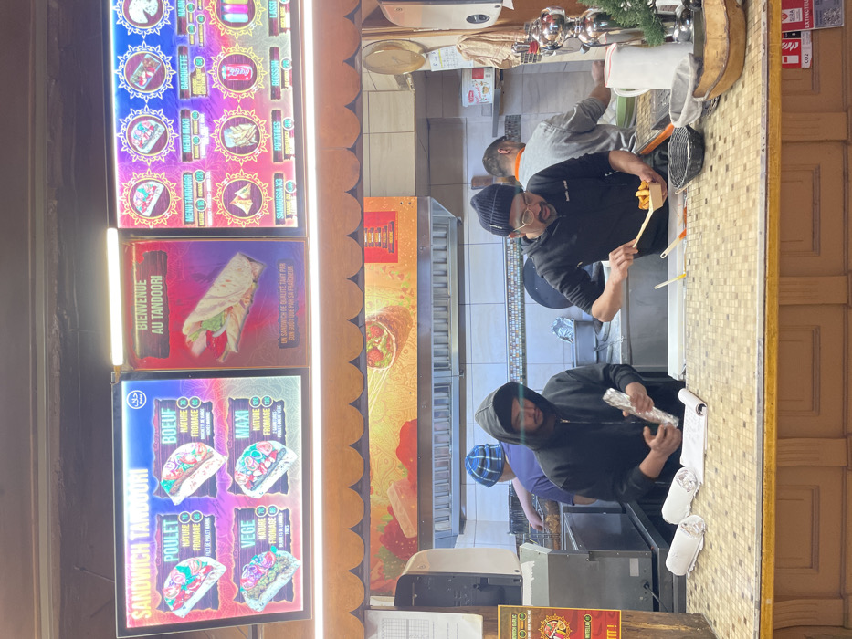 A vibrant "Sandwich Tandoori" menu displays colorful options like "Poulet," "Boeuf," and "Vege," with nature and fromage variations
