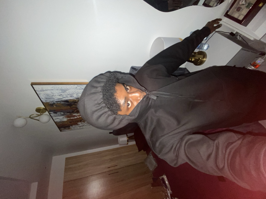 A single individual, identified as a young male of apparent African descent, is depicted indoors, ostensibly within a bedroom in Igboefon, Nigeria. The subject is positioned centrally, facing the camera with the right arm extended, indicative of a self-portrait. They are wearing a dark-colored, likely black, hooded sweatshirt with the hood drawn up, obscuring most of the head but revealing dark eyes looking directly forward, and short, dark, curly hair around the forehead. The background consists of a light-colored wall. To the left, a large wooden wardrobe or cabinet with two visible doors is present. On the wall to the right of the subject, an abstract framed artwork, featuring white, grey, brown, and gold tones, is mounted. Above the artwork, a modern wall-mounted light fixture with two spherical, white globes and a gold-colored frame is visible. Below the artwork, a white or light grey bedside table supports a table lamp with a white cylindrical shade and a gold-colored base, alongside a partially visible plastic water bottle. To the immediate right, a dark, rectangular box, appearing to be a watch or display case containing multiple items, rests on an adjacent surface, with the edge of a mirror also visible. The floor on the left side of the frame is covered with a dark red carpet, upon which some folded garments or textiles are placed. The scene is illuminated by artificial indoor lighting.