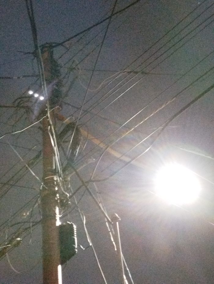 - "The image displays an outdoor nocturnal scene in Guacara, Venezuela, centered on a utility pole and an intricate network of overhead lines" by FM-uiwdr1, licensed under CC BY 4.0