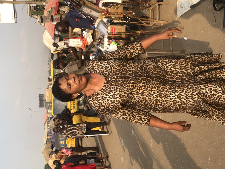 A woman in a leopard-print dress stands on a street with her arms outstretched. A yellow bus is visible in the background. People mill around near the bus. A market stall with various goods is behind the woman, with people gathered around it. The scene appears to be a bustling outdoor market or commercial area. The sky is overcast.