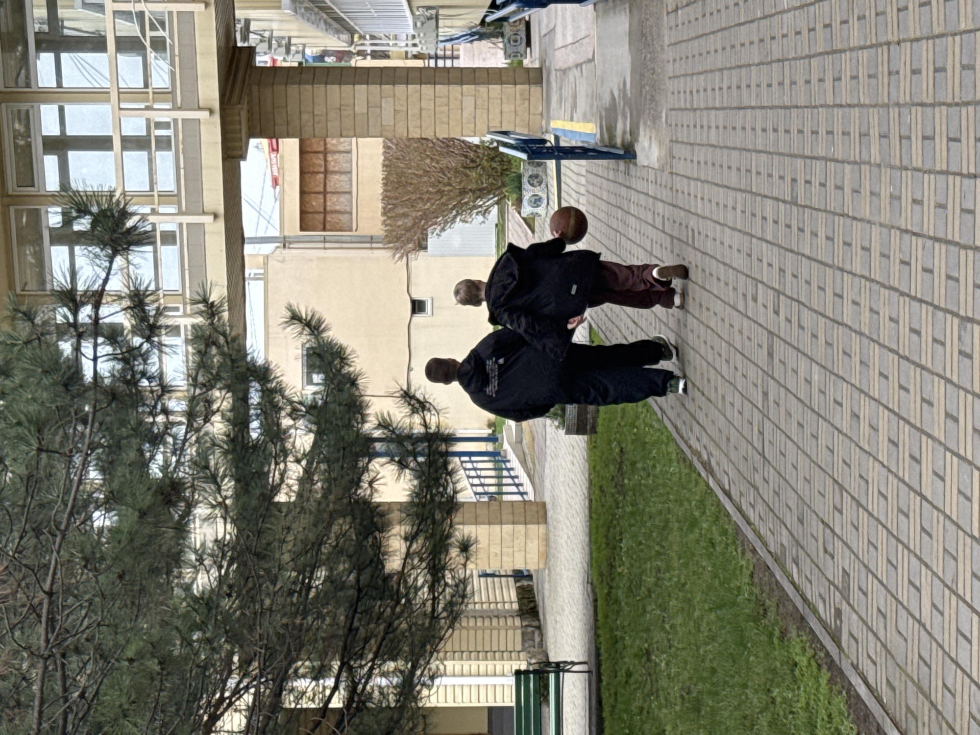 Location: Anapa, Russia. Two people, a taller one and a shorter one, are walking away from the camera on a paved walkway. The shorter person is holding a basketball. To the left is a pine tree and a light yellow building with many windows. To the right of the walkway is green grass. There are benches next to the building.