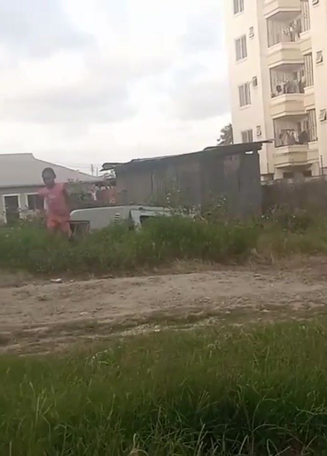 A boy and a girl are running on a dirt road. The boy is wearing a plaid shirt and dark pants. The girl is wearing a pink shirt and shorts. They are running away from the camera. Behind them is a building, a shed, and some overgrown grass and bushes. There is a van partially hidden by the overgrown grass. The sky is overcast.