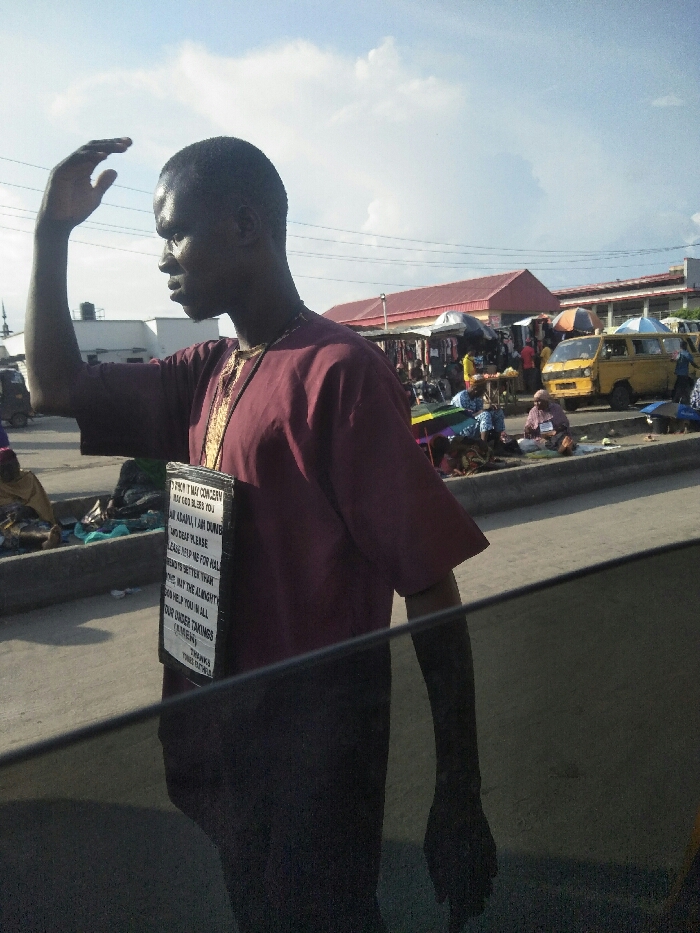 A dark-skinned adult male, identified as Adamu by a sign, is depicted in profile from the waist up, facing right. He wears a maroon-colored short-sleeved top with gold-colored embroidery around the neck. A white rectangular sign is suspended from his neck by a thin strap, displaying black text that reads, "TO WHOM IT MAY CONCERN / MAY GOD BLESS YOU / AM ADAMU, I AM DUMB / AND DEAF, PLEASE / PLEASE HELP ME FOR HALL / GMENTS TO BETTER THAN / NG MAY THE ALMIGHTY / GOD HELP YOU IN ALL / OUR UNDERTAKINGS / (AMEN) / THANKS / PLEASE HELP ME." His right arm is raised, with the hand open, positioned near his forehead as if shielding his eyes from sunlight. The image is captured from within a vehicle, with a dark window edge visible across the lower foreground. The background reveals a bustling outdoor market street scene in Awjaw, Nigeria, under a bright, cloudy daylight sky. People are visible engaged in market activities, some seated on the ground along a curb. Market stalls with various goods are present, and multiple umbrellas provide shade. A yellow commercial passenger van is parked or moving on the right side of the street. Buildings with red-tiled roofs are visible in the mid-ground, and lighter-colored buildings with a dark structure on top are visible further left. A slender, tall structure, possibly a minaret, is faintly visible on the far left horizon.