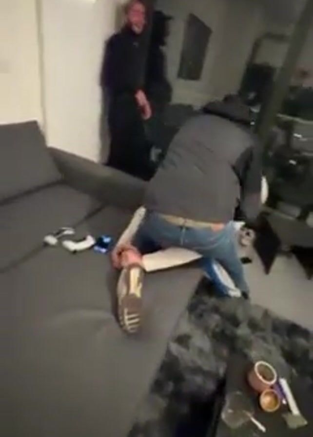two men grappling on a gray sofa. A third man stands near a window and observes. The man on top is wearing a dark jacket and jeans. The man underneath is wearing a white top and jeans. A controller and a phone are on the sofa. A coffee table next to the sofa has various items including a drinking glass, cigarette, lighter, and other small objects. The environment is a modern living room with a rug and glass doors.