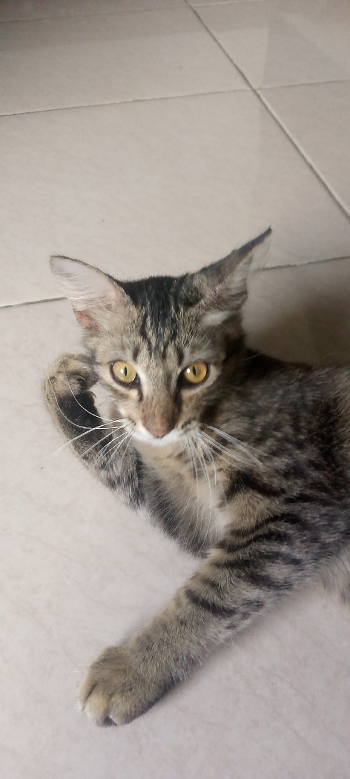 - "A tabby cat with amber eyes lies on a light beige tiled floor" by FM-uqdn02, licensed under CC BY 4.0