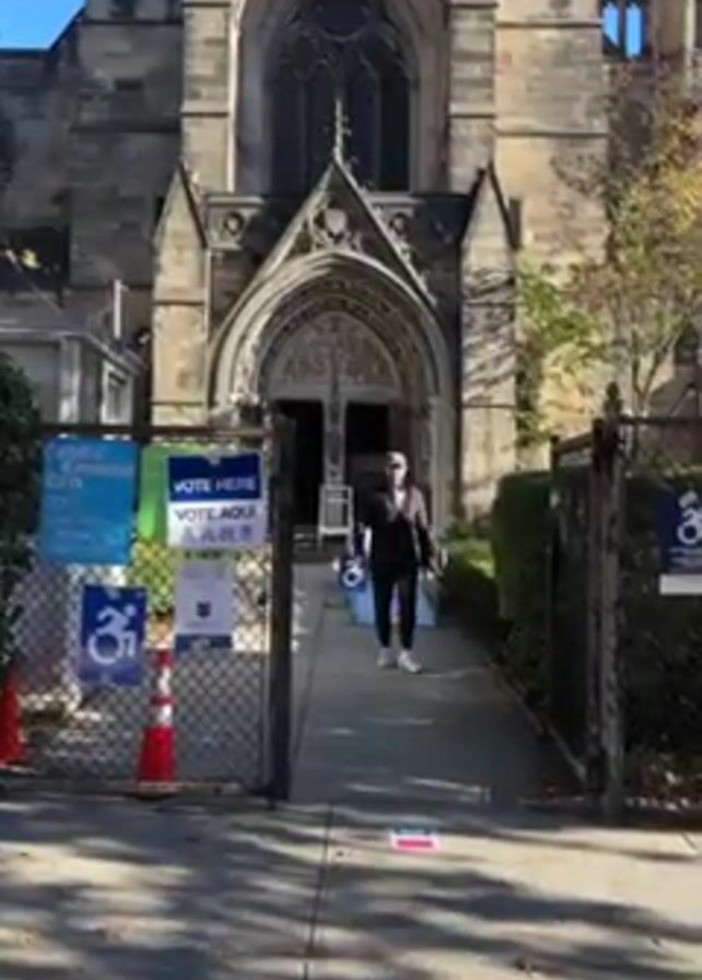 exterior of a large, stone church. A metal fence with signs including "Vote Here" stands in front of the entrance. People in casual clothing walk through the gate towards the church entrance. The sky is blue.