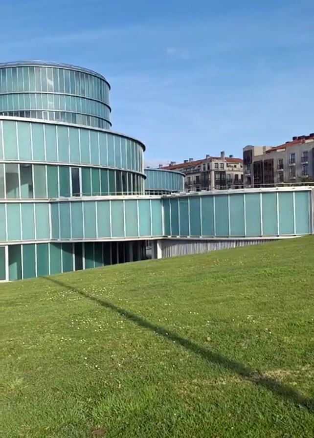 modern building with a circular design. The building appears to be constructed primarily of glass and white metal, with a multi-tiered structure topped by a cylindrical tower. In front of the building is a grassy hill, and a shadow of the person filming the video is visible on the grass. In the background, there are other buildings with more traditional architectural styles. The sky is blue with some scattered clouds. The light is bright and the day appears sunny.
